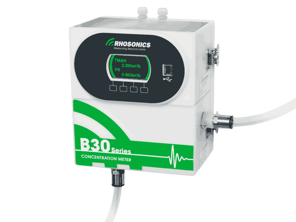 Rhosonics developed the CCM B30 model to measure the concentration of two or three chemicals in a solution. This meter is designed to measure complex chemical mixtures, such as TMAH+PR+(CO3), in Flat Panel Display manufacturing sites.